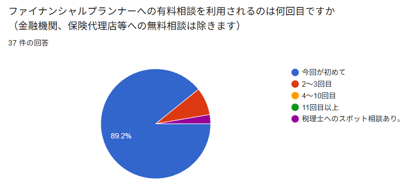 FPの有料相談サービスを利用するというのはまだ一般的ではなく、約9割の方が初めての利用という結果になりました。ただ、2~3回目という方もいて、有料相談経験者が少しずつ増えている印象もあります。