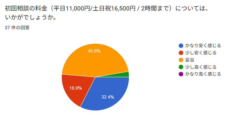 有料相談ということで初回からご相談料を頂戴していますが、料金設定については妥当と考える方が45.9%、かなり安いと感じる方が32.4%、少し安いと感じる方が18.9%という結果になっています。