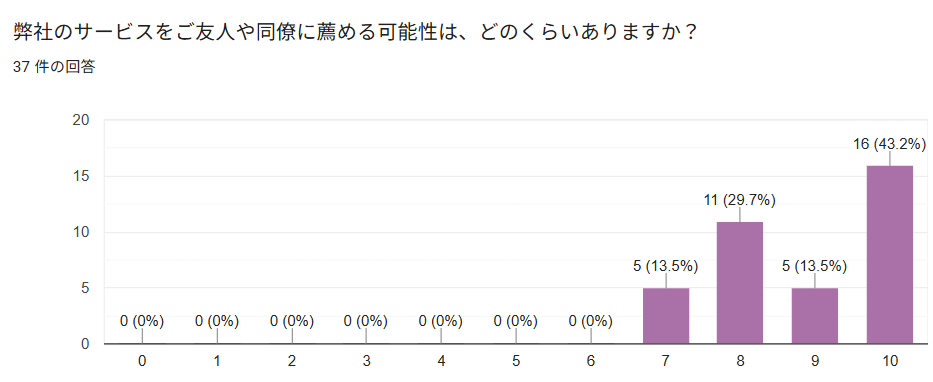 ご友人や同僚の方に弊社のサービスを薦める可能性があるかについてお伺いしたところ、11段階で最高スコアと回答した方が4割強の43.2%となりました。