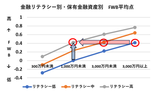 ある調査データによれば、資産が3,000万円以上あっても金融リテラシー(お金の知識)が低い人は、資産が1,000万円未満でもリテラシーが高い人と比較して、経済的な満足度が同程度であるという結果が出ています。