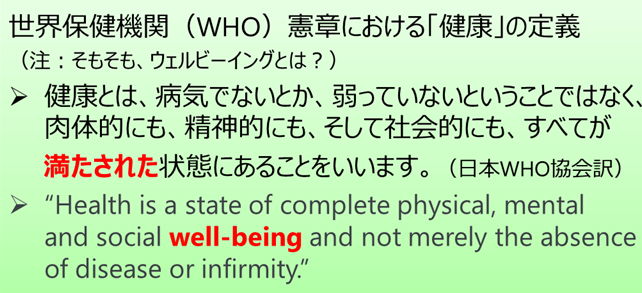 「ウェルビーイング(Well-being)」とは、もともと世界保健機関(WHO)が「健康」を定義している表現の中に使われている言葉で、心も体も社会的な状況も「すべてが満たされた状態」といった意味になります。