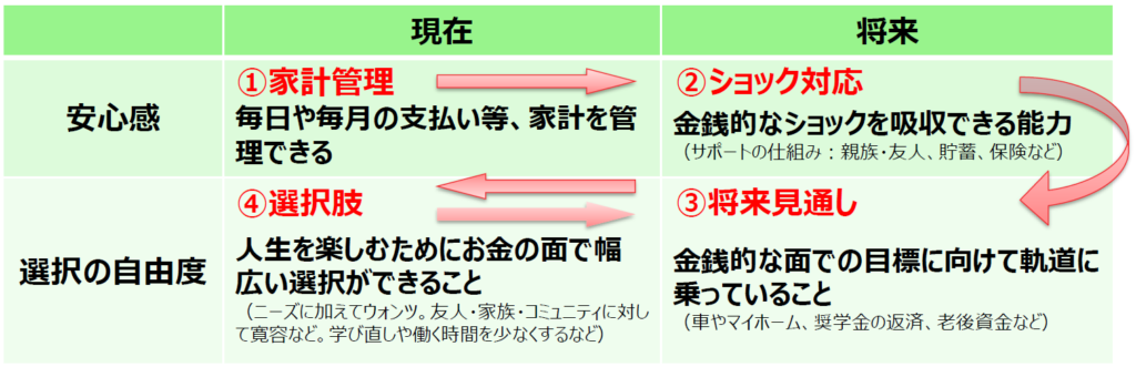 病気や失業、急な冠婚葬祭などの金銭的なショックがあっても、貯蓄や保険、頼れる人間関係によって吸収できる準備がある状態。 - 将来見通し:目標に向けて順調である(将来の選択の自由)