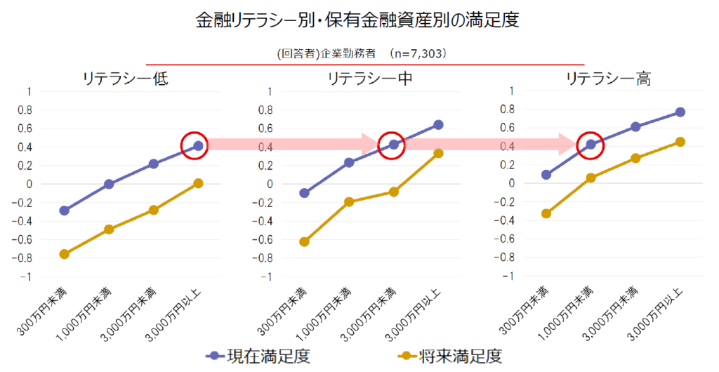 また別の調査によれば、同じ資産額を持っていても、金融リテラシーが高い人の方が、経済的な満足度が高いことがわかっています。例えば、資産が3,000万円以上あってもリテラシーが低い人は、資産が1,000万円未満でもリテラシーが高い人と幸福度が同程度である、という興味深いデータもあります。