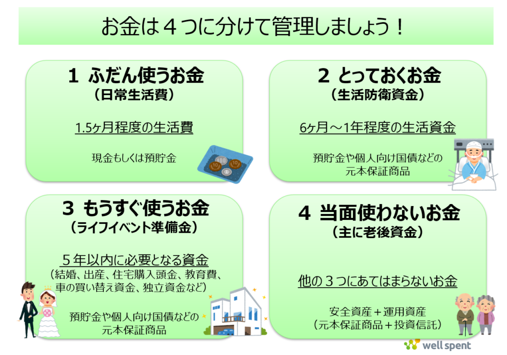 資産状況が見えたら、お金を役割ごとに次の4つのポケットに分けて整理することをおすすめします。