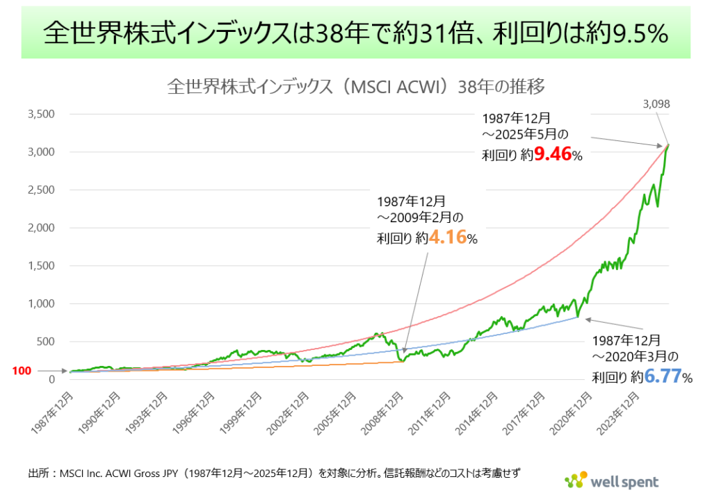 検証期間を含む1987年から2025年までのデータを見ると、全世界株式インデックスは約31倍に成長しており、年率平均利回りは約9.46%に達します。リーマンショックやコロナショックといった一時的な暴落はあっても、15年、20年、30年といった長期のスパンで見れば、一時的な買い付け価格の差は、その後の大きな成長にかき消されてしまうのです。