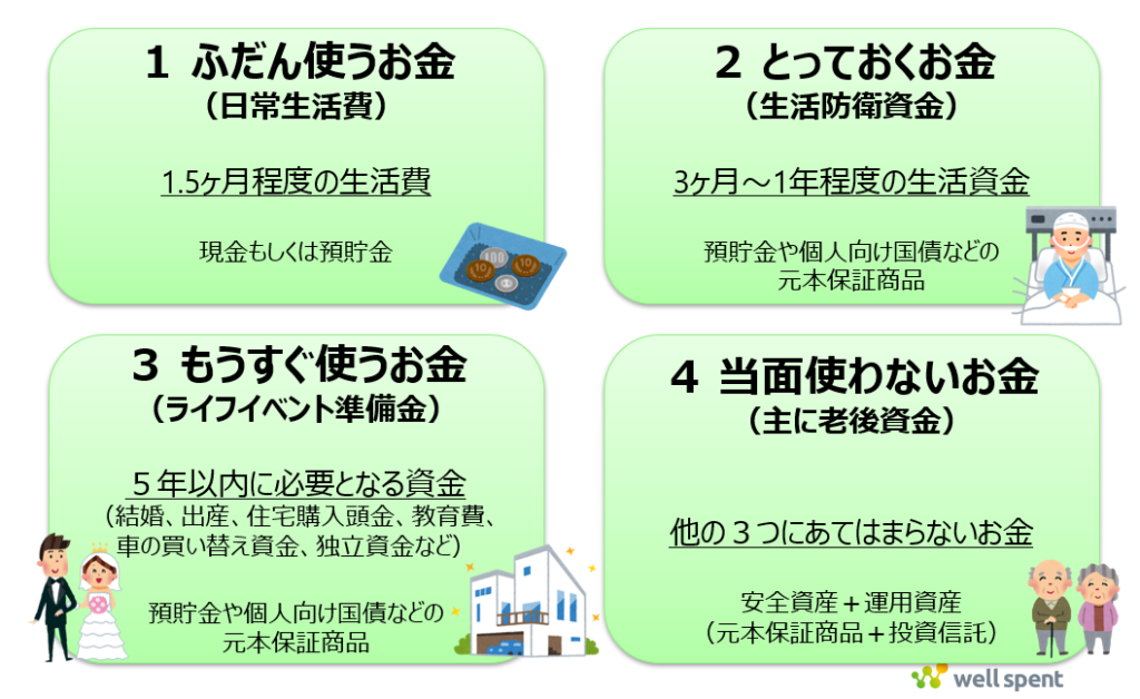 - とっておくお金(生活防衛資金): ここがショック対応の主役です。 予期せぬトラブルに備え、生活費の3ヶ月〜1年分程度を、流動性の高い預貯金や個人向け国債等で確保しておきます。