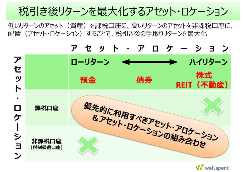 - 期待リターンの低い資産(ローリターン資産): 「課税口座」へ配置