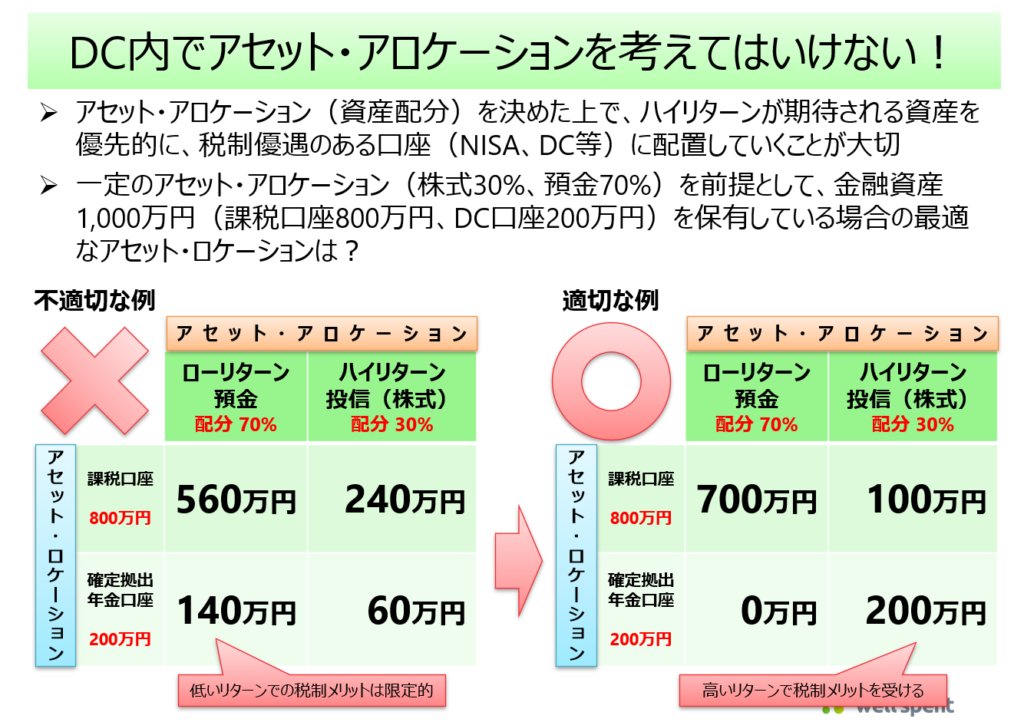• 不適切な例: DC口座内で「株式30%(60万):預金70%(140万)」