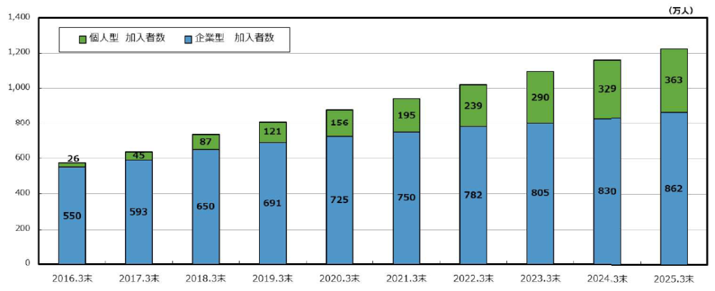 まず「企業型」ですが、加入者数は862万582人に達しました。 2016年3月末時点では約550万人だったため、この9年間で約300万人以上増加した計算になります。 制度を導入する事業所数も5万8,000件を超え、多くの企業で「退職金の代替」や「将来への上乗せ」としての仕組みが定着しています。