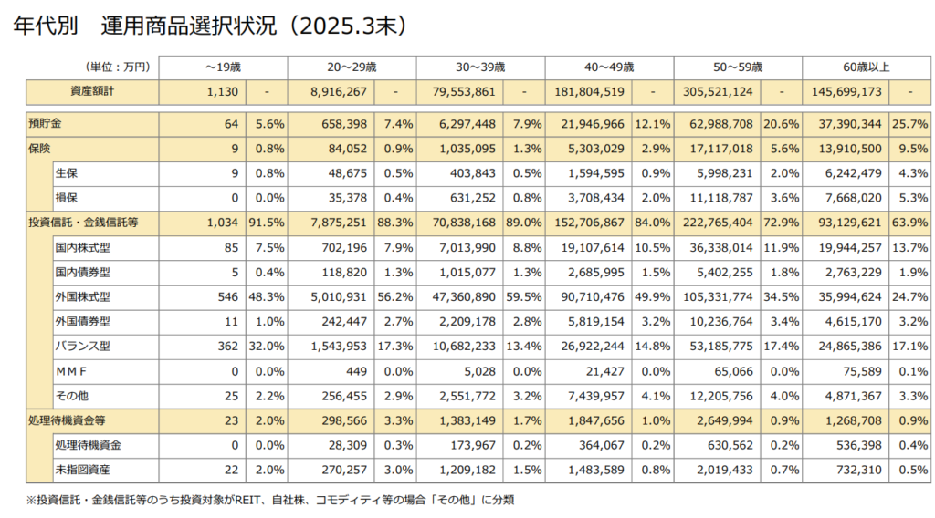 退職が近づく世代は守りの姿勢を強めます。iDeCoの60代以上の預貯金割合は25.7%、保険は9.5%と、元本確保型の合計が約35%まで高まります。 企業型でも年齢が上がるにつれて預貯金の割合が増える傾向にあります。