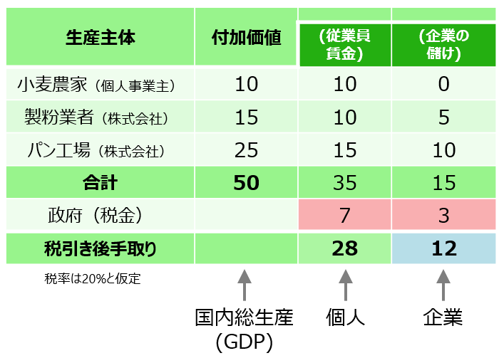 - 製粉業者: 農家から15円で買った小麦に、さらに10円のエネルギー費用をかけて小麦粉にし、パン工場に40円で売ります。ここでの付加価値は、40円 - 15円 - 10円 = 15円です。