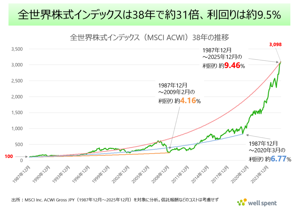 この経済成長に伴い、世界の株価も長期的に見れば右肩上がりで推移してきました。代表的な世界株式の指標である「MSCI ACWI(オール・カントリー・ワールド・インデックス)」のデータによると、1987年から2025年までの38年間で、世界株価は約31倍(年率約9.46%)に上昇しています。