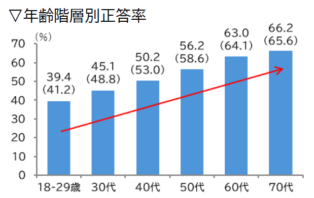 1. 日本人の正答率は「約54%」。年齢とともに高まる傾向に