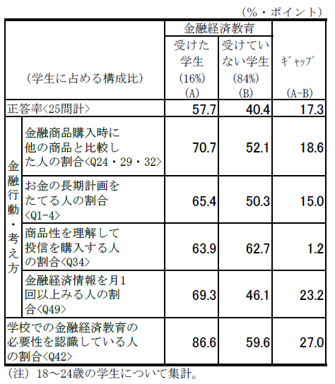 この調査で最も注目すべきは、「お金の教育(金融経済教育)」を受けた経験の有無による差です。