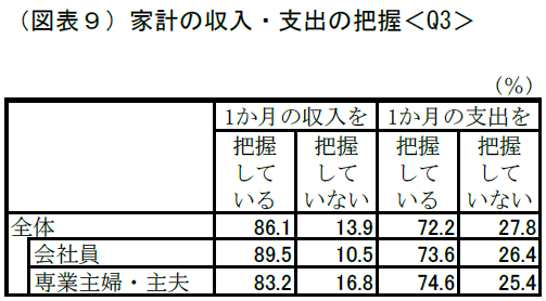 - 得意なこと:毎日の「家計管理」 「1ヶ月の収入・支出を把握している」という人は約7割から9割にのぼります 。また、7割以上の人が「何かを買う前に、余裕があるか注意深く考える」と回答しており 、日々の管理については意識が高いことが分かります。