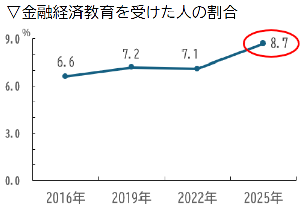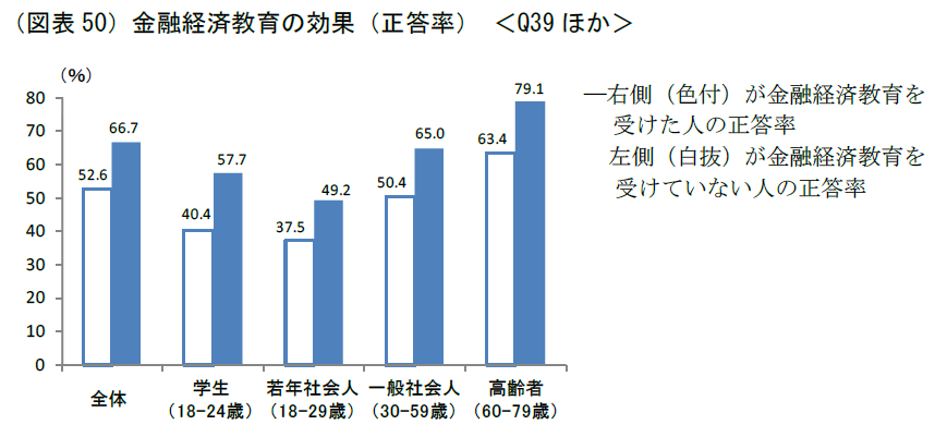 「学校や職場で金融経済教育を受けた」と認識している人は、わずか8.7%しかいません 。しかし、その教育を受けた人の正答率は66.7%と、受けていない人の52.6%を大きく上回っています 。