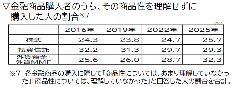 しかし、注意が必要な点も見つかりました。株式や投資信託、外貨預金などを購入したことがある人のうち、約3割が「商品性を十分に理解せずに購入した」と回答しているのです 。リスクや手数料、元本保証の有無などを正しく理解しないまま投資を始めることは、思わぬトラブルの原因になりかねません。