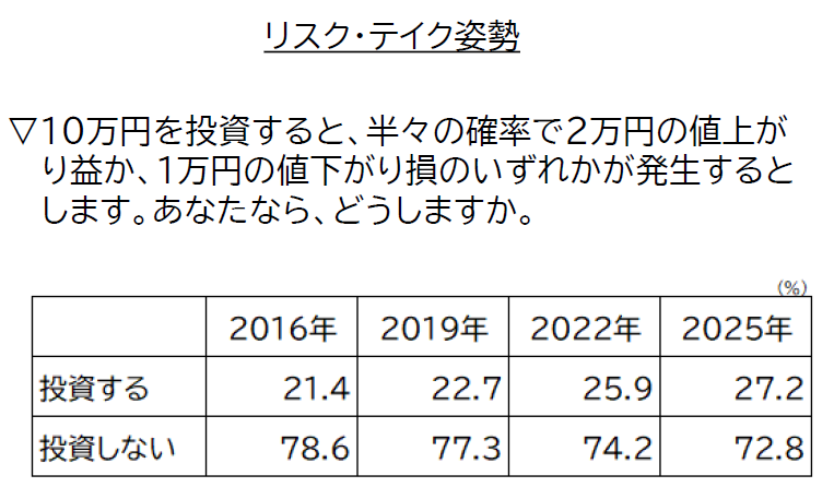 その結果、多くの日本人は「損失回避傾向」が非常に強いことが分かりました。例えば、「期待収益率が+5%(勝つ確率が50%、勝てば2割増、負けても1割減)」という好条件の投資でも、7割以上の人が「投資しない」と回答しています。