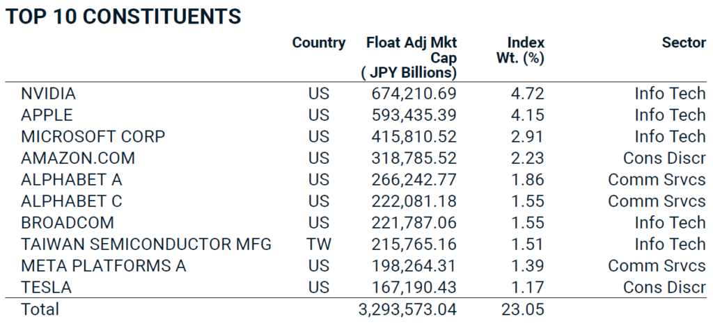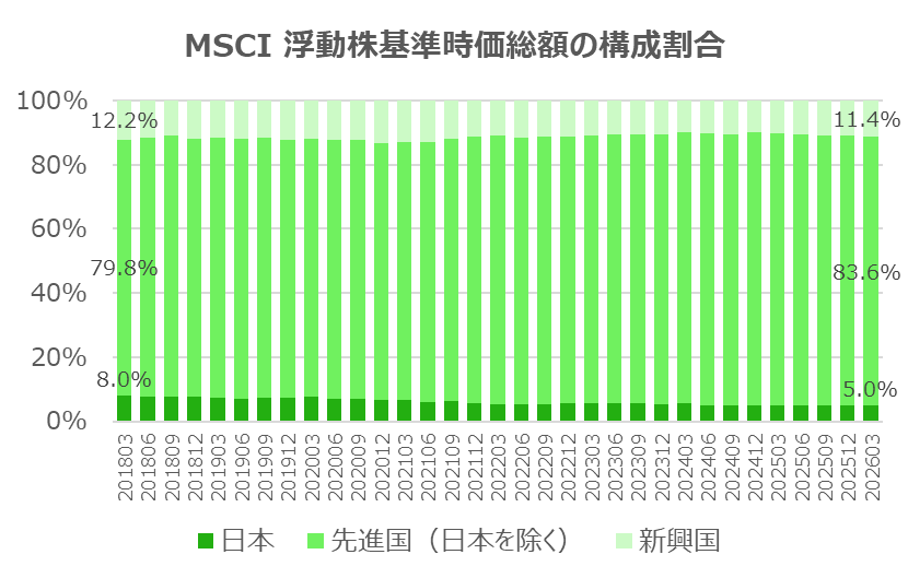 また、構成割合(日本、先進国、新興国)は、日本が約5%、先進国が約84%、新興国が約11%とほぼ変化していませんが、米国の比率が64.0%から63.2%へと0.8%減少していることが確認できます。